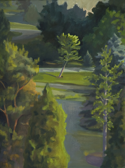 “Tree Company”. There was an article in the news about a staircase structure at Cox Arboretum that looked incredible. It was! and gave me a great vantage point to do this painting in the late evening sun.